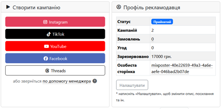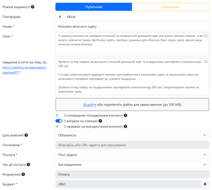 Вкажіть загальну суму рекламного бюджету. Значення може бути 0, в цьому випадку поповнення відбувається під час оформлення замовлення з блогером.